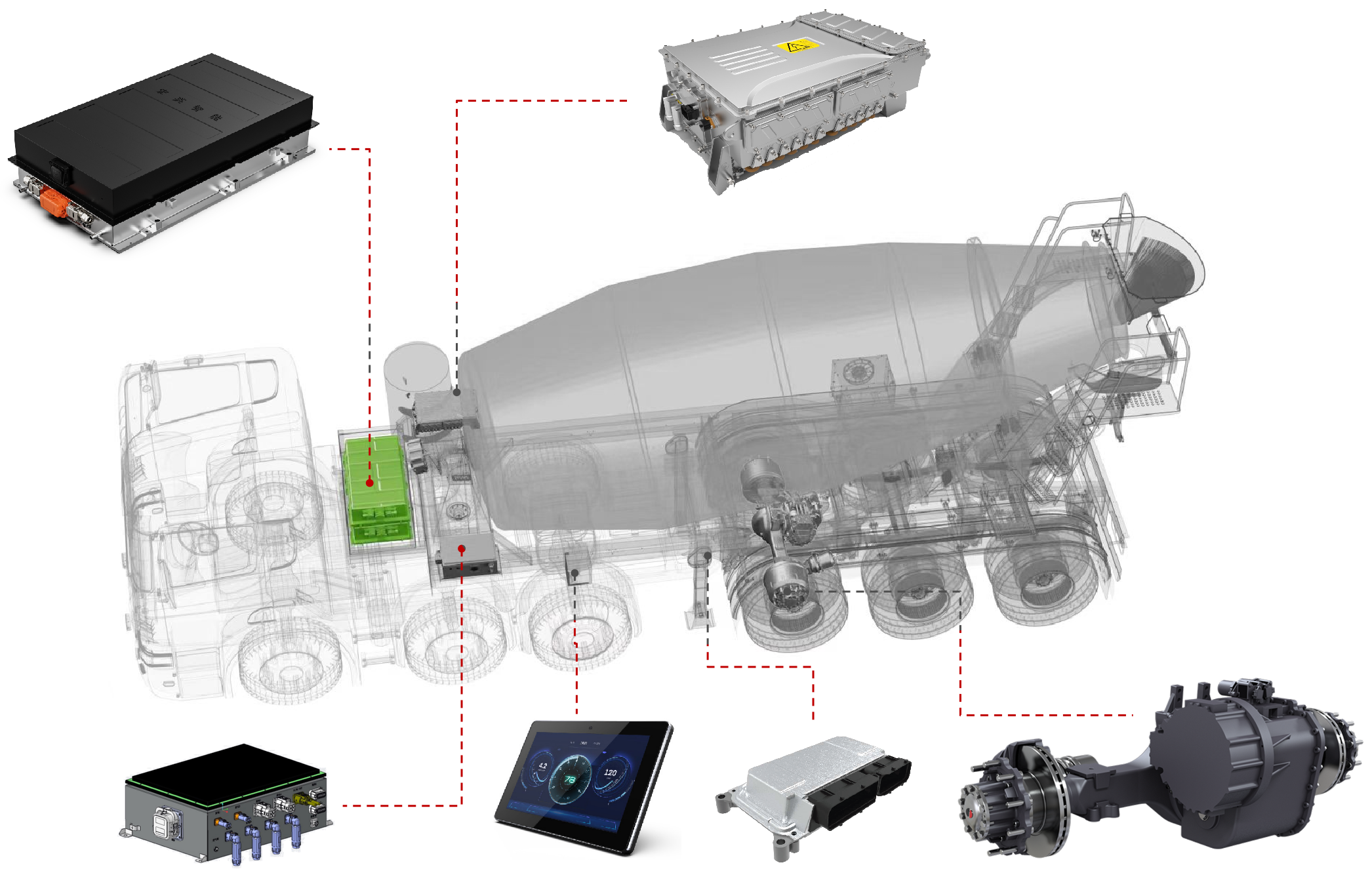聯合研發的混合動力牽引攪拌半掛車,以其開創性的頭掛一體智能驅動技術,開辟了綠色高效商砼運輸的新天地。它集成了先進的混合動力技術,實現了混凝土攪拌運輸車產品高效能、低排放、輕量化、智能化的目標,引領混凝土行業對高品質攪拌運輸車的需求。